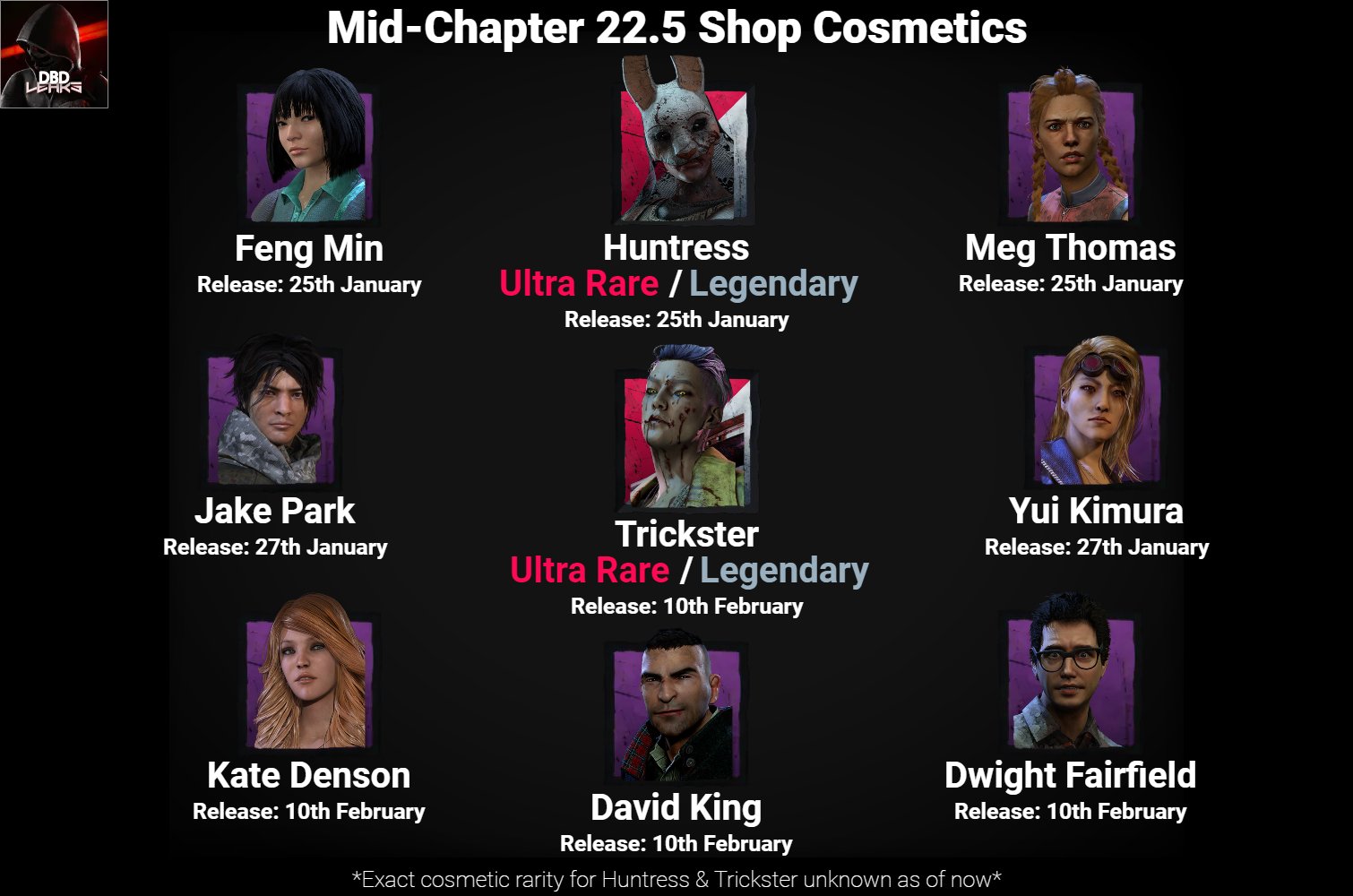 Twitter Dbdleaks على تويتر List Of Mid Chapter 22 5 Cosmetics Cosmetics For Pig And Detective David Tapp Saw Legendary Or Ultra Rare Cosmetics For Huntress Amp Trickster Deadbydaylight Dbdleaks Leaksdbd Dbd Https T Co Hua8ghqroo
